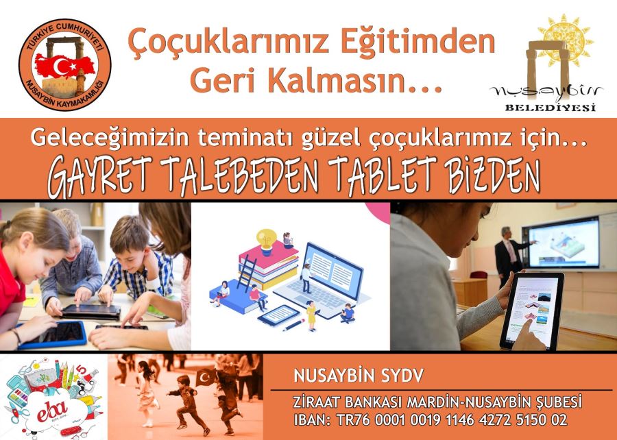 ‘Gayret Talebeden Tablet Bizden’ sloganıyla başlatılan kampanya hakkından Nusaybin Kaymakamlığından yapılan açıklamada, “İlçemizde EBA'ya erişimde zorluk çeken dar gelirli öğrencilerimize yönelik yapacağımız bu çalışma için bütün eğitim gönüllülerini destek vermeye davet ediyoruz. Kaymakamlığımız, Eğitim Camiamız, Belediyemiz, Kamu Yöneticilerimiz, İş İnsanlarımız, STK'larımız, Esnaflarımız, Velilerimiz ve Hayırsever Halkımızı kampanyamıza destek olmaya, öğrencilerimize katkı yapmaya davet ediyoruz. Kampanyaya katılım için Nusaybin Kaymakamlığı Sosyal Yardımlaşma ve Dayanışma Vakfı Ziraat Bankası Nusaybin Şubesi (Iban: TR76 0001 0019 1146 4272 5150 02) hesap numarasına bağışta bulunabilirsiniz” ifadeleri kullanıldı.