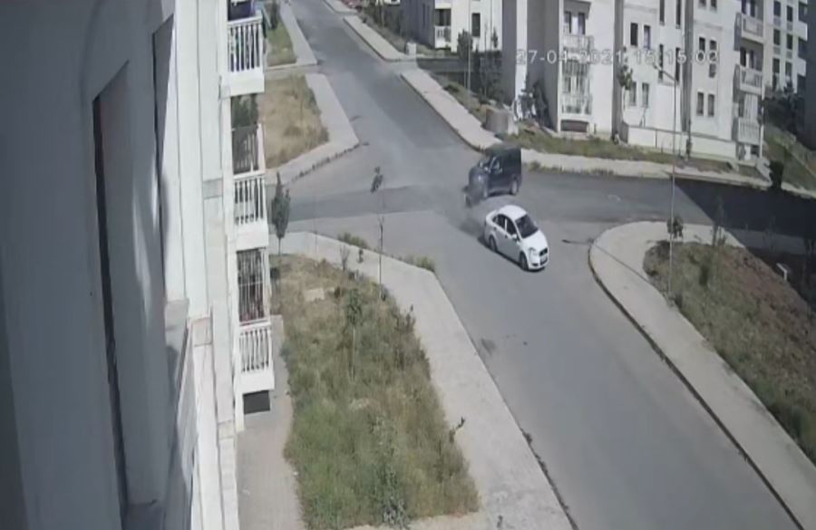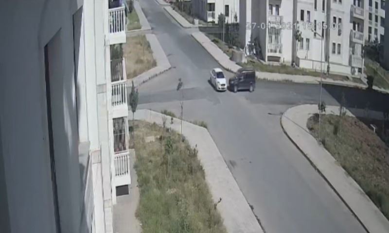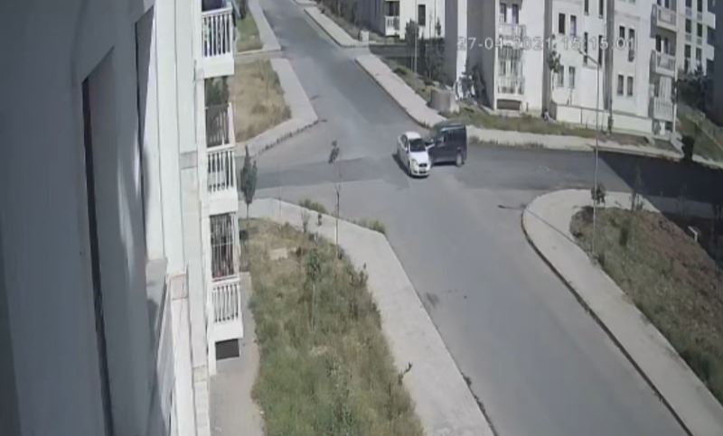Ayrı ayrı sokaklardan çıkan iki araç boş sokakta çarpışır ken güvenlik kameralarına böyle yansıdı. Kazada, çarpışmanın etkisiyle siyah araç ön kısmı, beyaz araç ise yandan hasar gördü.