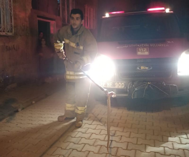 Ahmet AKKUŞ/-MARDİN’in Nusaybin ilçesinde Sahur vakti bir evin avlusuna giren 1 metre uzunlukta ve yaklaşık 15 santim kalınlıkta olan yılan ev sakinlerine korku dolu anlar yaşatarak eve kapanmalarına neden oldu, itfaiye ekiplerinden yardım istedir. Ekipler, bölgeye gelerek, yılan kimseyi ısırmadan yakalayıp doğaya Salı verildi.