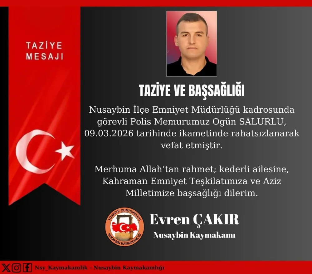 “Nusaybin İlçe Emniyet Müdürlüğü kadrosunda görevli Polis Memurumuz Ogün Salurlu, 09.03.2026 tarihinde ikametinde rahatsızlanarak vefat etmiştir.