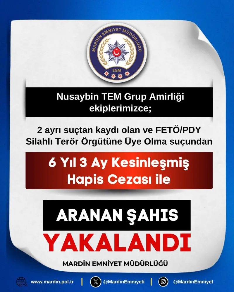 Yapılan çalışmalar sonucu, “FETÖ/PDY Silahlı Terör Örgütüne Üye Olma” ve 2 ayrı suçtan aranan, hakkında 6 yıl 3 ay kesinleşmiş hapis cezası bulunan bir şahıs 9 Ekim 2025 günü Nusaybin’de gözaltına alındı.
