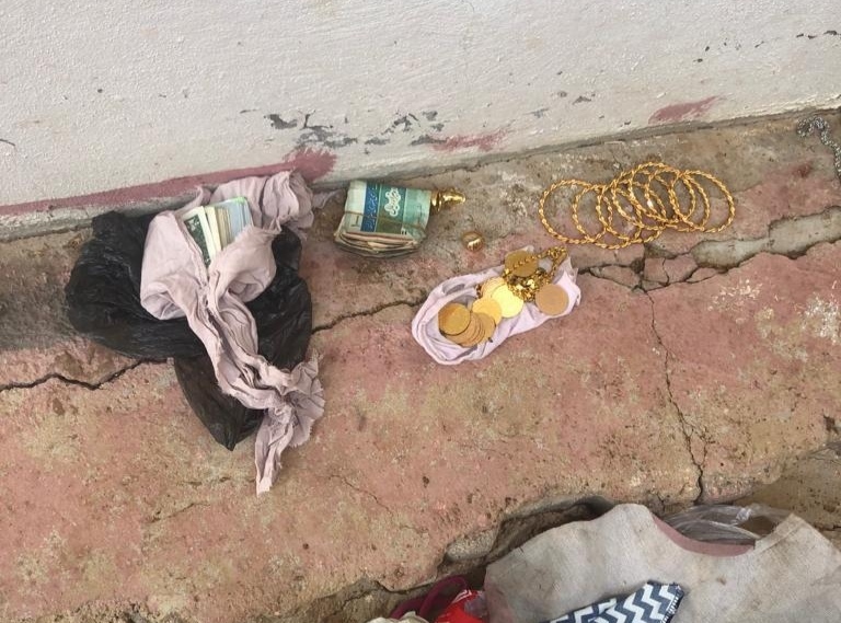 Çalınan para, ziynet ve diğer malzemelerin bulunmasına yönelik evin avlusunda dedektör ve gerekli ekipmanlarla yapılan arama-tarama sonucunda evin bahçe kısmında toprağa gömülü vaziyette, 4 bin 734 Amerikan doları, 260 Euro, 58 adet menşei tespit edilemeyen kağıt banknot, 13 adet Cumhuriyet altını, 7 adet Altın Bilezik, 1 adet altın zincir, 3 adet altın yüzük, 7 adet çeşitli ebatlarda tesbih ve çeşitli kişisel malzemeler, 2 adet pasaport ile farklı isimler adına düzenlenmiş kurum ve banka kartları bulundu.