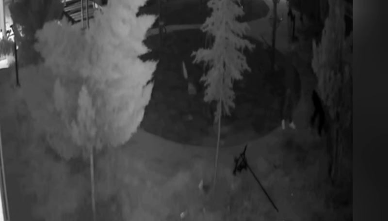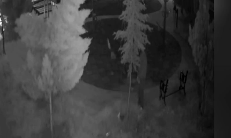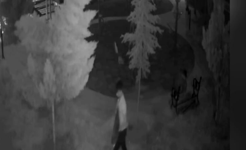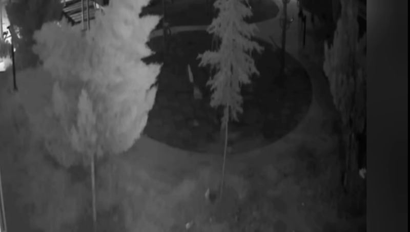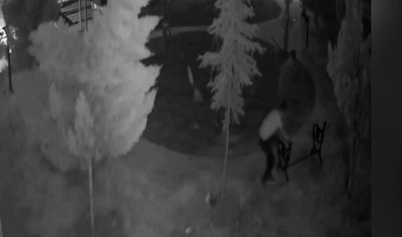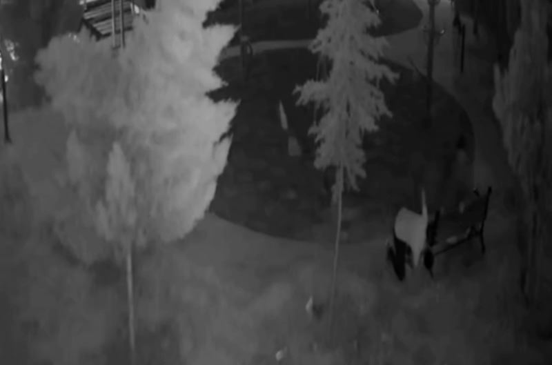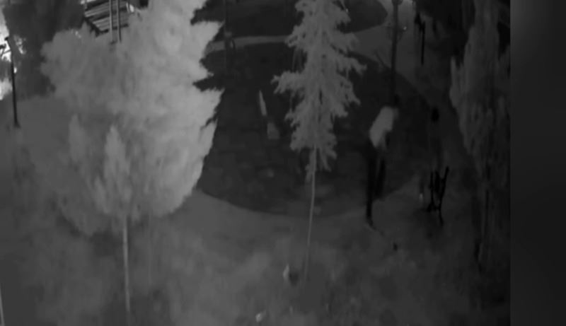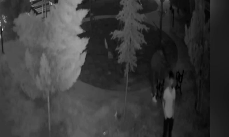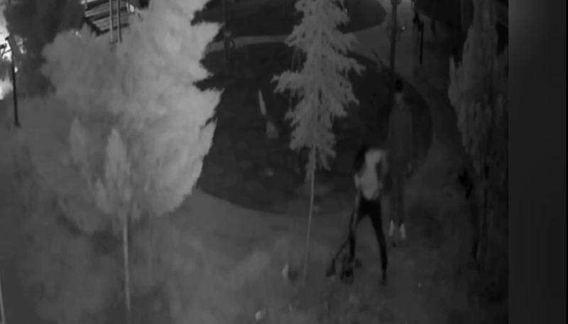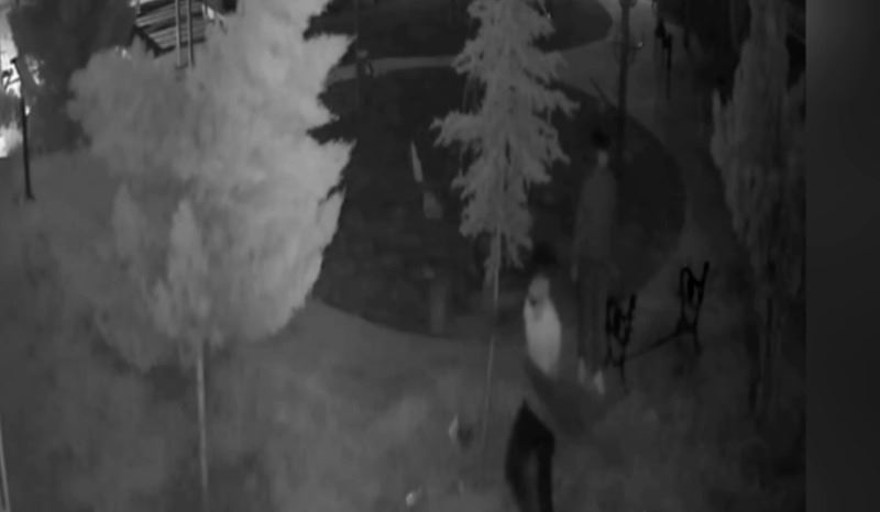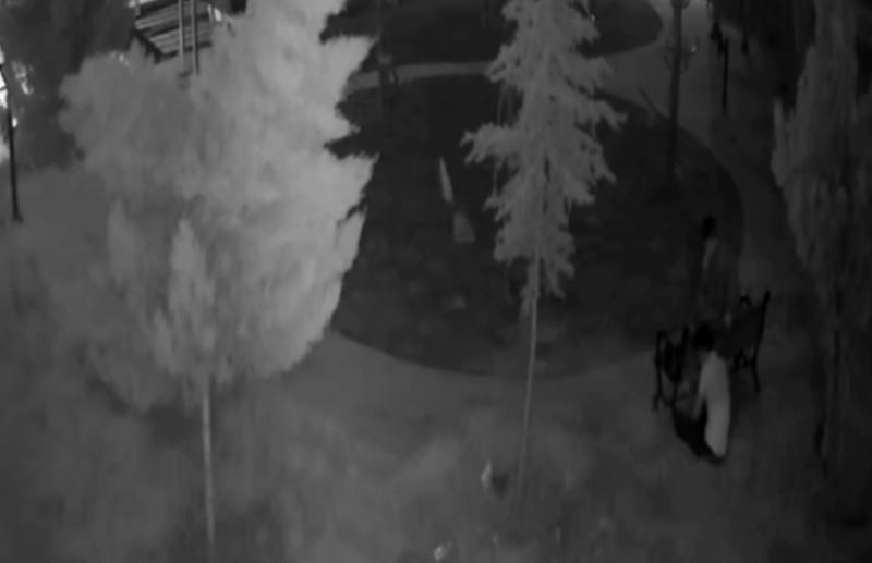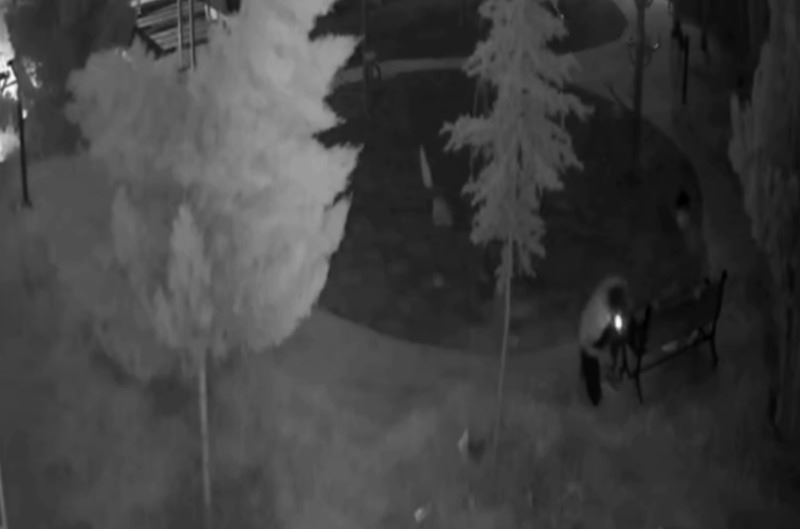 Güvenlik kameraları görüntülerinde, kimliği belirsiz iki hırsız, parkın oturma bankını 12 dakikada sokup ve kırarak çalarken güvenlik kamerasına böyle yansıdı.