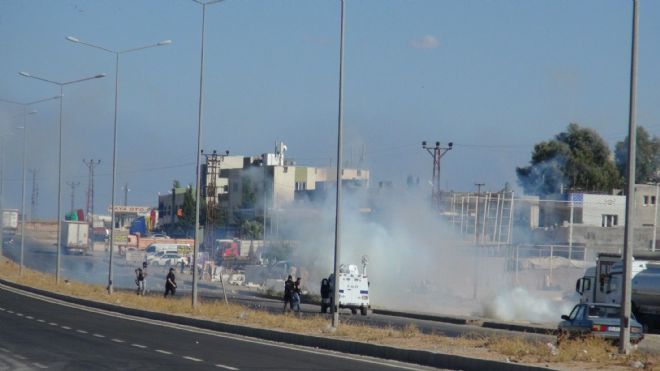 Nusaybin İlçesi`nde IŞİD protestosunun ardından İpek yolu`nu trafiğe kapatıp, polise el yapımı ses bombası,molotof kokteyli,taş ve havai fişeklerle saldıran gruba, gaz bombası ve basınçlı su ile müdahale edildi.