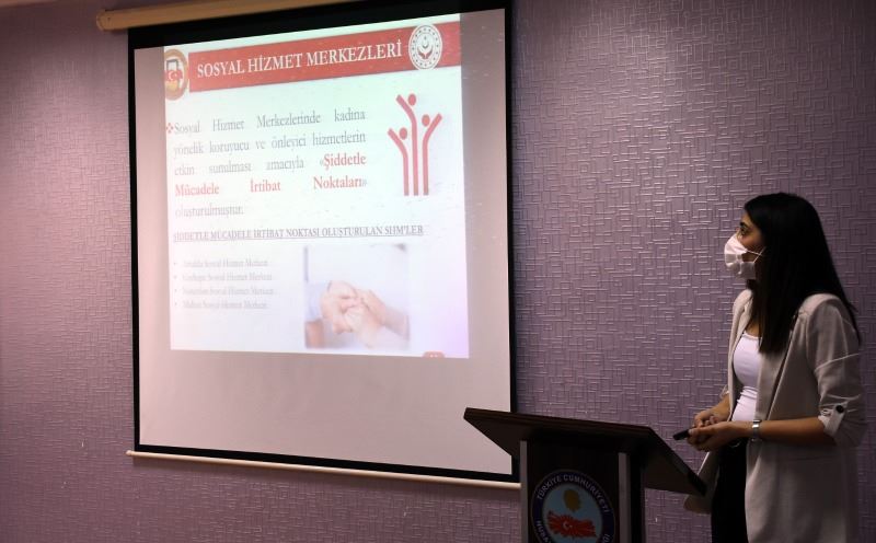 Nusaybin Sosyal Hizmet Merkezi Müdürlüğünde görevli Psikolog Çiğdem Aygün tarafından yapılan sunumda, Aile ve Sosyal Hizmetler Bakanlığı, Mardin İl Müdürlüğü ve Nusaybin Sosyal Hizmetler Müdürlüğü tarafından Kadına Şiddetle Mücadele kapsamında yapılan çalışmalar hakkında bilgi verdi.