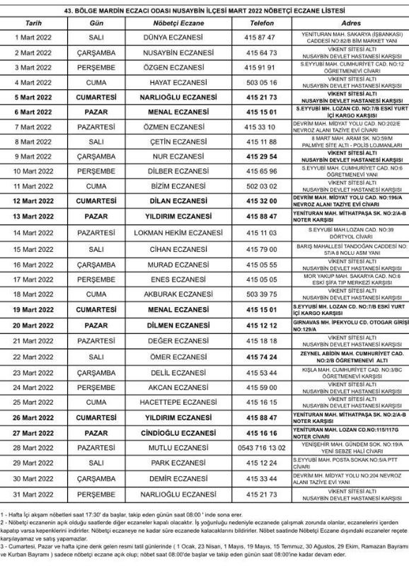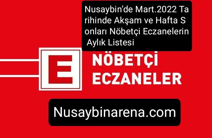 Nusaybin ilçesinde Mart.2022  Tarihinde Akşam ve Hafta sonları nöbetçi Eczanelerin Aylık listesi aşağıda yar almaktadır.