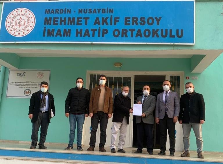 Türk Diyanet Vakfı tarafından Suriye'de bulunan ve çadırlarda yaşayan mazlumlar için yaptırılan iyilik konutları kampanyasında; Bir konutta bizden olsun diyen Mehmet Akif Ersoy İmam Hatip Ortaokulu öğretmen ve velileri, topladıkları paranın dekontu Türk Diyanet Vakfı Nusaybin temsilcisi Müftü Üsame Anlağan'a teslim etti.