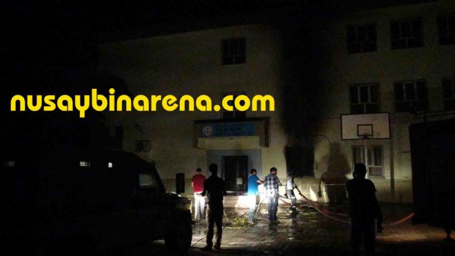 Nusaybin İlçesi`nde Yıldırım Ortaokulu`na düzenlenen molotoflu saldırıda çıkan yangın itfaiye ekipleri tarafından söndürülürken, okulun idari odasındaki eşyalar kullanılamaz hale geldi.