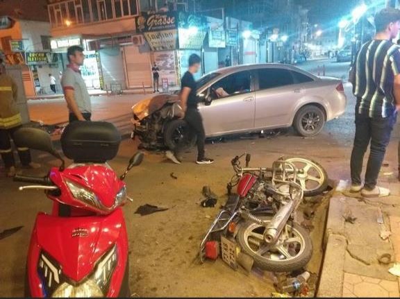 Ahmet AKKUŞ/Mardin'in Nusaybin ilçe merkezinde otomobil ile motosikletin çarpışması sonucu motosiklet üzerinde bulunan 2 kişi, çarpmanın etkisiyle fırlayarak iş yerin camlarına çarparak  yaralandı.