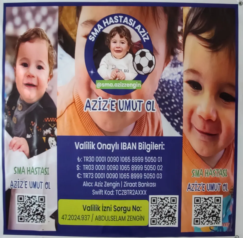 Nusaybin Zeynel Abidin Mahallesi Petek Sokak A04 Daire No:19’da oturan 3 çocuk babası Abdulselam Zengin’in 3’üncü çocuğuna 8 aylık iken SMA Tıp-1 ölümcül kas hastası teşhisi konulan ve şu anda 16 aylık olan bebek Aziz Zengin’in durumu ağırlaşmadan tedavisi için hayırseverlerin yardımını bekliyor.