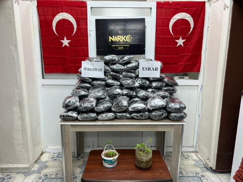 Nusaybin İlçe Emniyet Müdürlüğüne bağlı Narkotik Grup Amirliği ekiplerince uyuşturucu satıcılarına yönelik operasyon düzenledi. Belirlenen bir adreste Narkotik dedektör köpeği eşliğinde yapılan aramalarda, toplam ağırlığı 58 Kilo 950 gram olan esrar maddesi ile 23 kök hint keneviri bitkisi ele geçirildi.