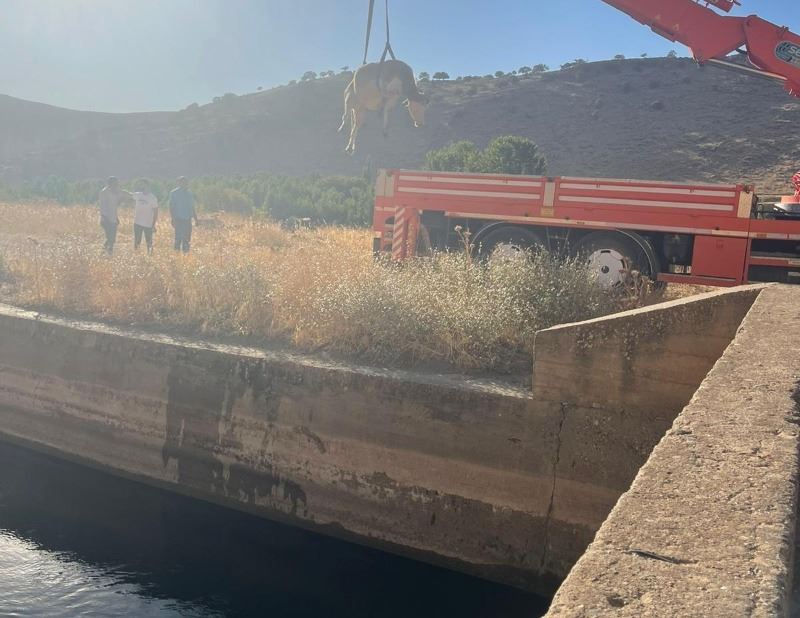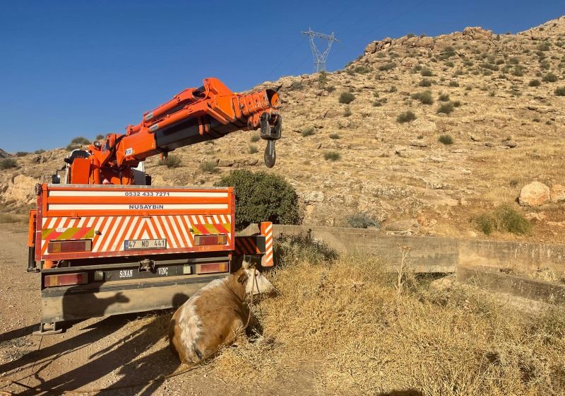 Mardin’in Nusaybin ilçesinde su kanalına düşen inek boğulmak üzereyken bölgeye çağırılan vinç yardımıyla kurtarıldı.