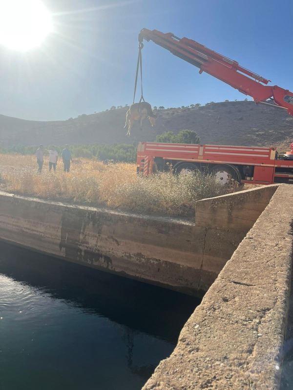 Vinç yardımıyla su kanalındaki inek boğulmak üzereyken yara almadan kurtarılarak, inek sahibine telim edildi.