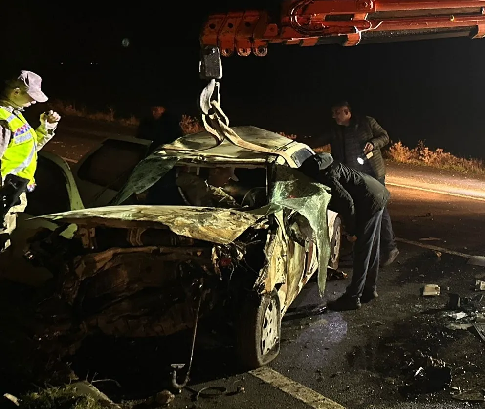 Kazada hurdaya dönen otomobil, vinç yardımıyla bölgeden kaldırıldı.