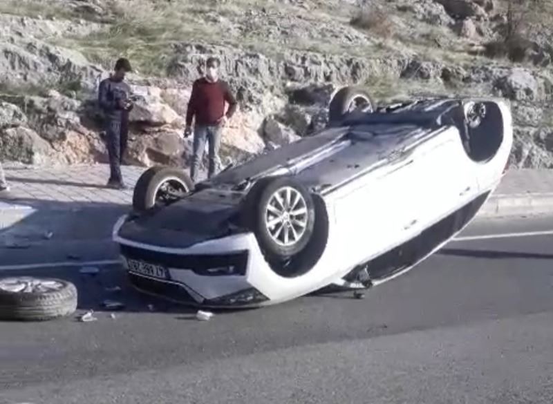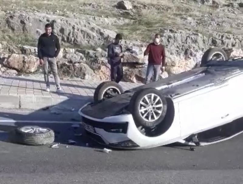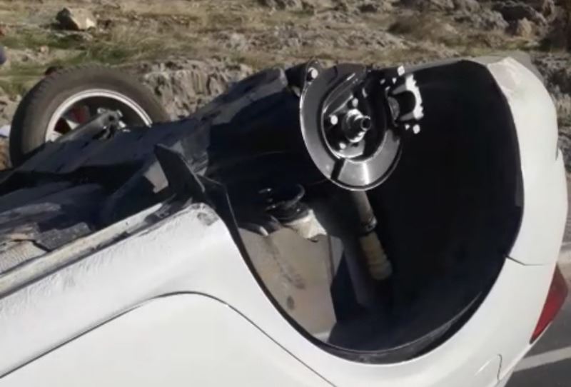 Kazada takla atarak ters dönen otomobilin arka tekerleği koptuğu görüldü.