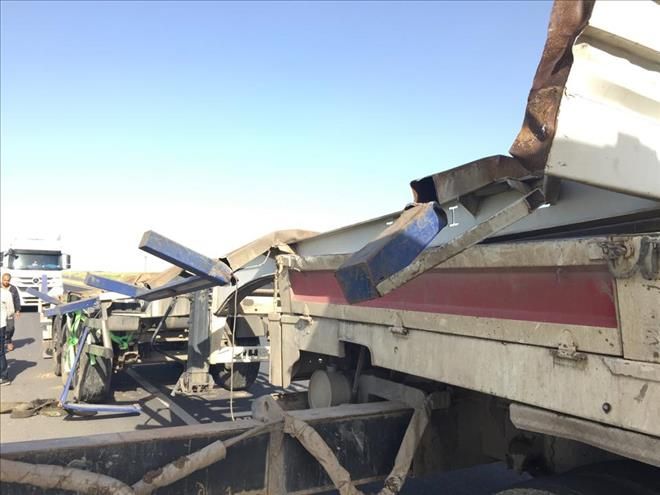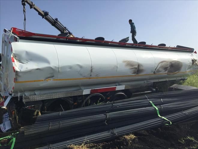 Nusaybin ilçesinde demir yüklü tır üzerine tankerde yüklenince devrildi.