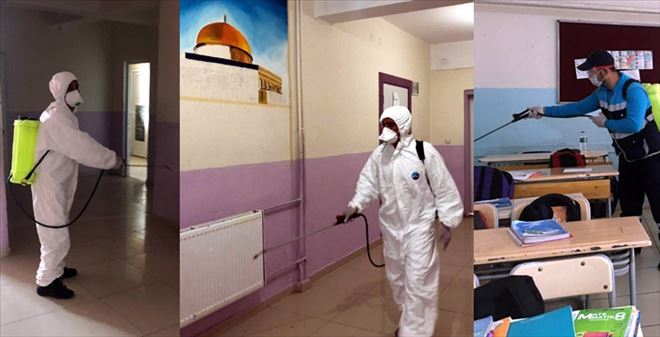 Okullar giden özel giyimli ekipler, okullarda sınıfları, koridorları, idareci ve öğretmen odaları, okul sığınakları ve depolarda dezenfekte çalışmaları yaptı.