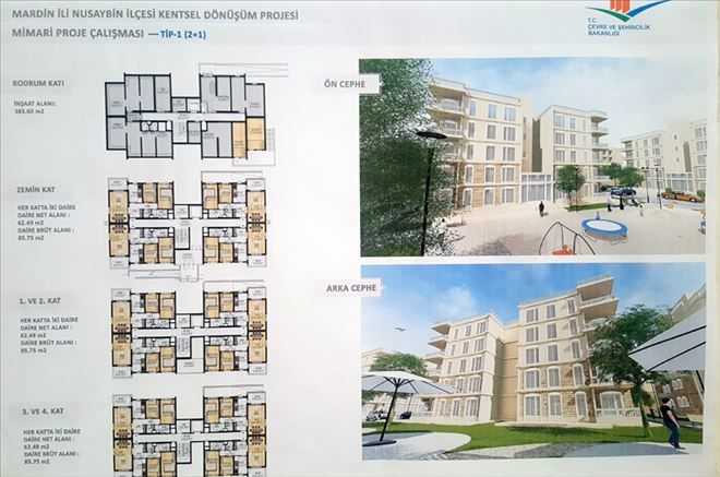 Mardin´in Nusaybin ilçesinde yıkılan yerleşim yerlerine yapılacak yeni projenin görselleri paylaşıldı. 5 katlı binalar 2+1, 3+1 ve 4+1 şeklinde yapılacağı belirtildi.