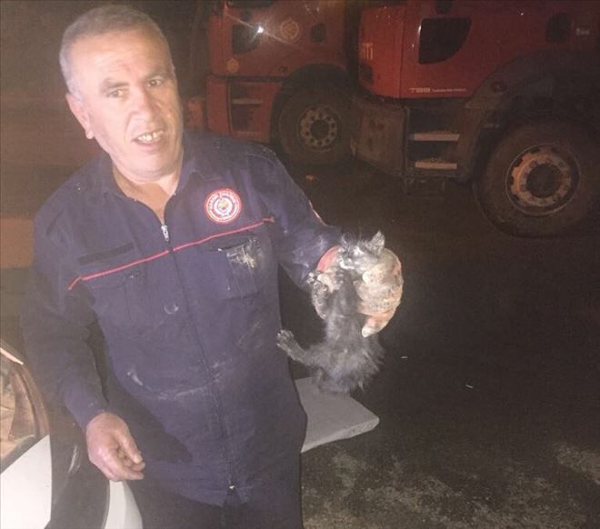 Mardin´in Nusaybin ilçesinde park halinde duran otomobil içinde mahsur kalan kedi, itfaiye ekipleri tarafından kurtarıldıktan sonra etle beslediler.