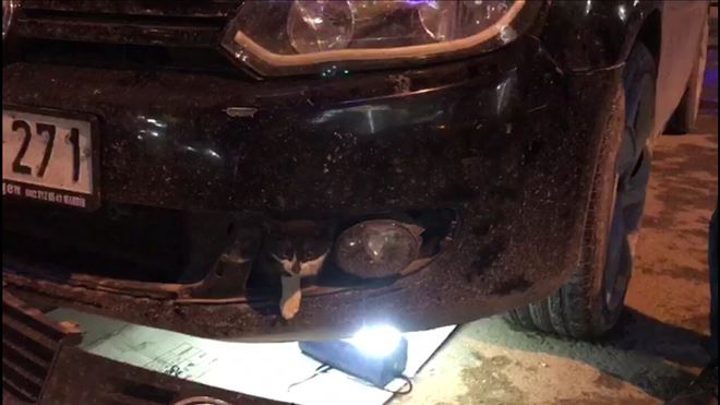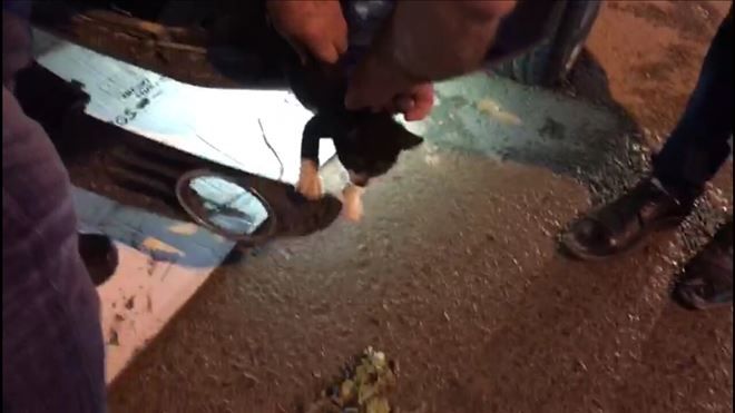 Mardin´in Nusaybin ilçesinde otomobil´in tanpon kısmında sıkışarak mahsur kalan kediyi istirahatlı itfaiyeci tarafından kurtarıldı.