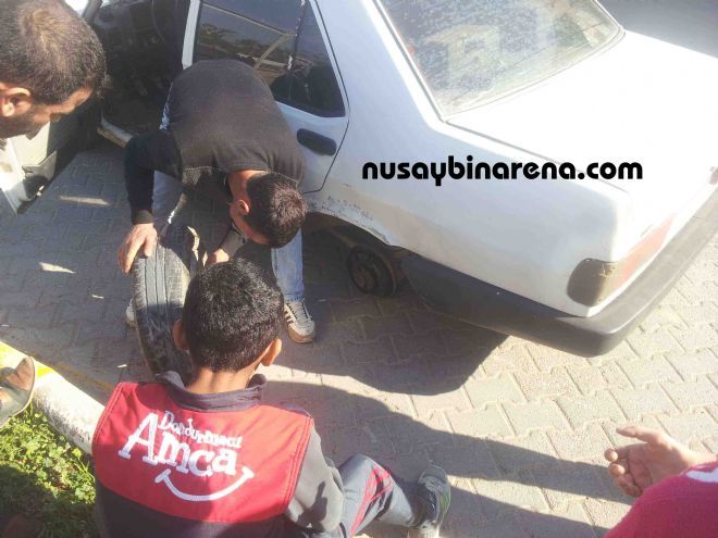 Nusaybin Devrim Mahallesi hükümet konağı caddesi üzerine seyir halindeki sürücüsünün ismi belirlenmeyen 73 AD 738 plakalı otomobil virajı aldığı sırada otomobilin tekerleği altından fırladı. Araçta 6 kişinin bulunması faciadan kıl payı kurtuldu. Sürücü fırlayan lastiği alarak yine takmaya başladı.-Haber-Ahmet Akkuş