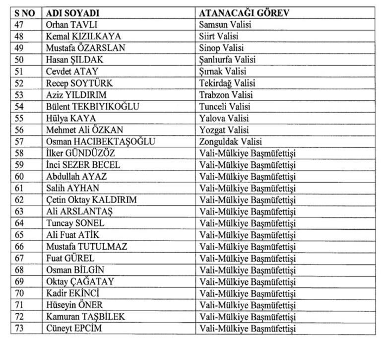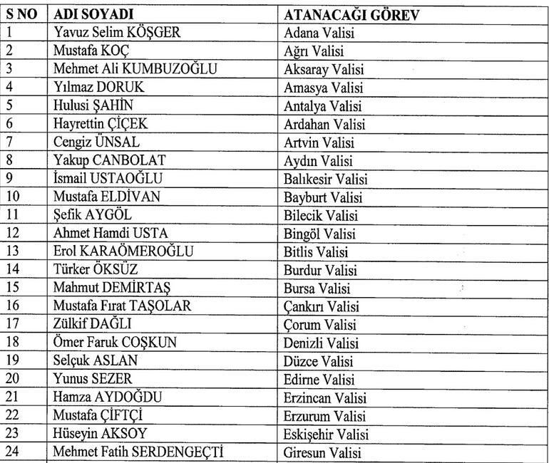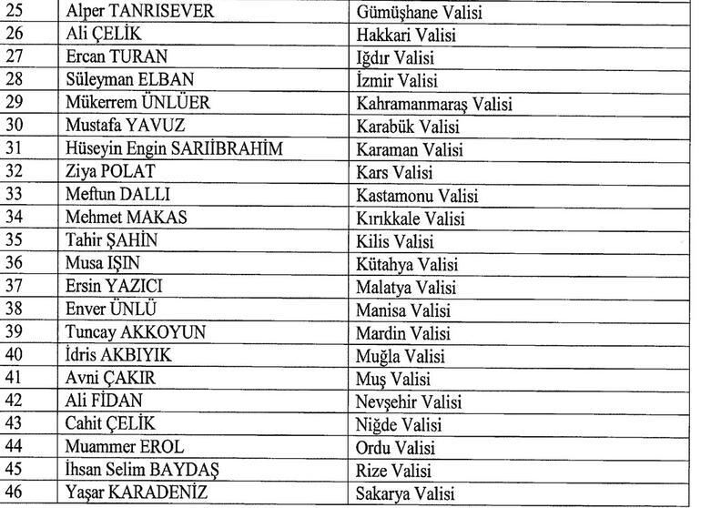 Yasar Karadeniz ise Sakarya Valisi oldu. Şırnak Valisi Osman Bilgin Mülkiye Başmüfettişliğine atandı. Cevdet Atay Şırnak Valisi oldu. Muğla Valisi Orhan Tavlı, Samsun Valisi oldu, Samsun Valisi Zülkif Dağlı Çorum Valisi oldu. Karaman Valisi Tuncay Akkoyun Mardin Valiliğine atandı.