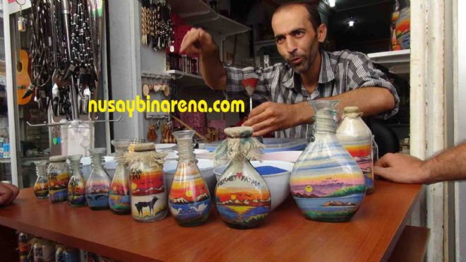 Mahmud,burada bir kaç ay çalıştım,burada beni gören çok kişi beni turistlik bölgelere, Antalya gibi yerlere çağırdılar,ancak ban Nusaybin’de bu sanatımı devam ettireceğim dedi. Geçimini bu sanattan sağladığını.’’dile getrdi.Mahmud,cam kavanozların içine renkli kumlarla adeta harikalar yaratacak süsler yapıyor.-Haber-Ahmet Akkuş