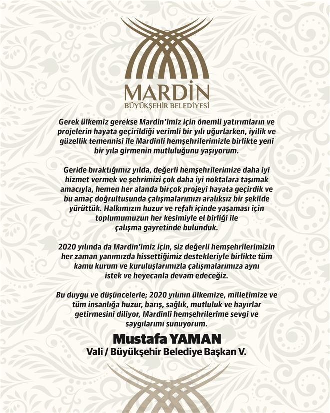 Vali Mustafa Yaman tarafından yayınlanan mesajda şu ifadelere yer verdi: Bir yılı daha yaşanmış anıları ve sevinçleriyle geride bırakmanın hüznü ve yeni umutlarla yeni bir yılı karşılamanın mutluluğu içerisindeyiz. Sevgili Mardinliler;Unutmamalıyız ki; hedefleri ve hayalleri yüksek olan milletler, başarıya ulaşan milletlerdir. Her yeni yıl, yeni beklentileri de beraberinde getirmektedir. 2020 yılına dair beklenti ve umutlarımız; ülkemizin ve buna bağlı olarak Mardin´imizin kalkınması, refahı, huzuru ve birliği yönünde olacaktır. Bunun içinde daha fazla çalışmak zorunda olduğumuzun bilinci içerisindeyiz.
