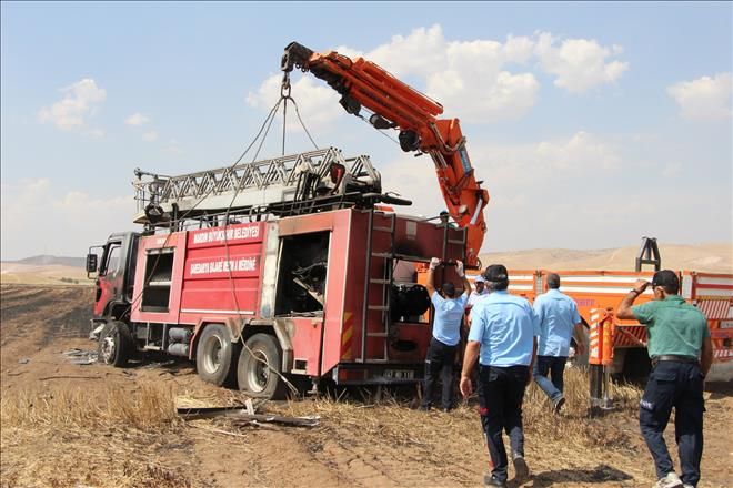 Nusaybin ilçesinde anız yangınların buğday ekinlerine sıçramaması için söndürme çalışmaları yaparak yanan itfaiye aracı yerinden kaldırıldı.
